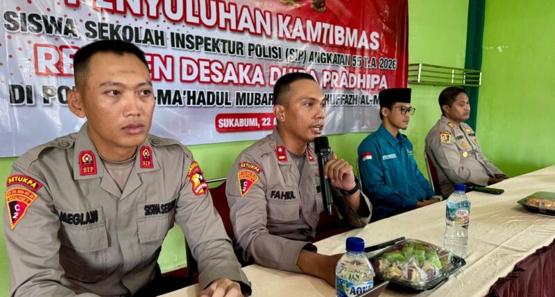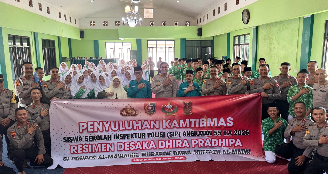 LINTAS SUKABUMI — Siswa Sekolah Inspektur Polisi (SIP) angkatan 55 Tahun 2026 Resimen Desaka Dhira Pradhipa Kelas 3 Sindikat 58 Batalyon Trisula menggelar penyuluhan keamanan dan ketertiban masyarakat (kamtibmas) di Pondok Pesantren Al-Ma’Hadul Mubarok Huffazh Al-Matin, Sukabumi, Rabu (22/4/2026).